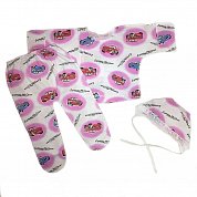 Комплект состоит из распашонки с рукавчиками трансформерами и с кнопочкой на одной стороне, ползунков на резинке, чепчика. Все швы у набора выполнены наружу. Рисунки в каждой партии отличаются.
