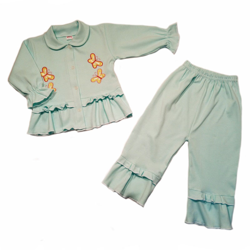 Костюм состоит из кофточки с воротничком, с длинным рукавом на конце на резиночке, спереди на кнопочках, украшена вышивкой на обеих полочках, снизу с рюшкой,  и штанишек на резинке, снизу украшены рюшкой.